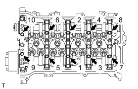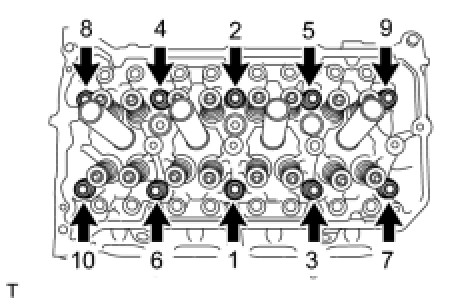 Using several passes, uniformly install and tighten the 10 cylinder head set bolts and plate washers with a 10 mm bi-hexagon wrench in the order shown in the illustration.