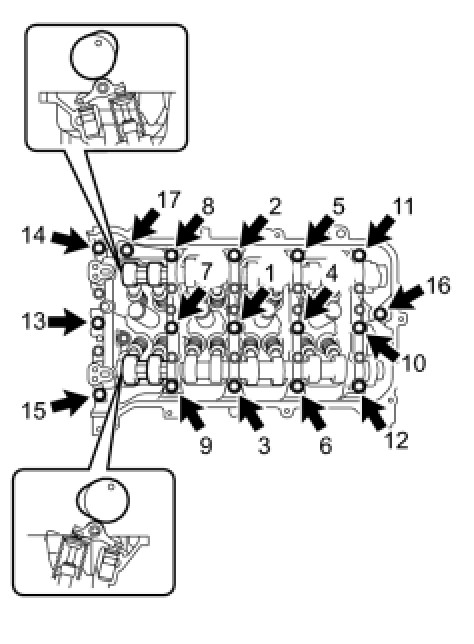 Install the camshaft housing and tighten the 17 bolts in the order shown in the illustration.