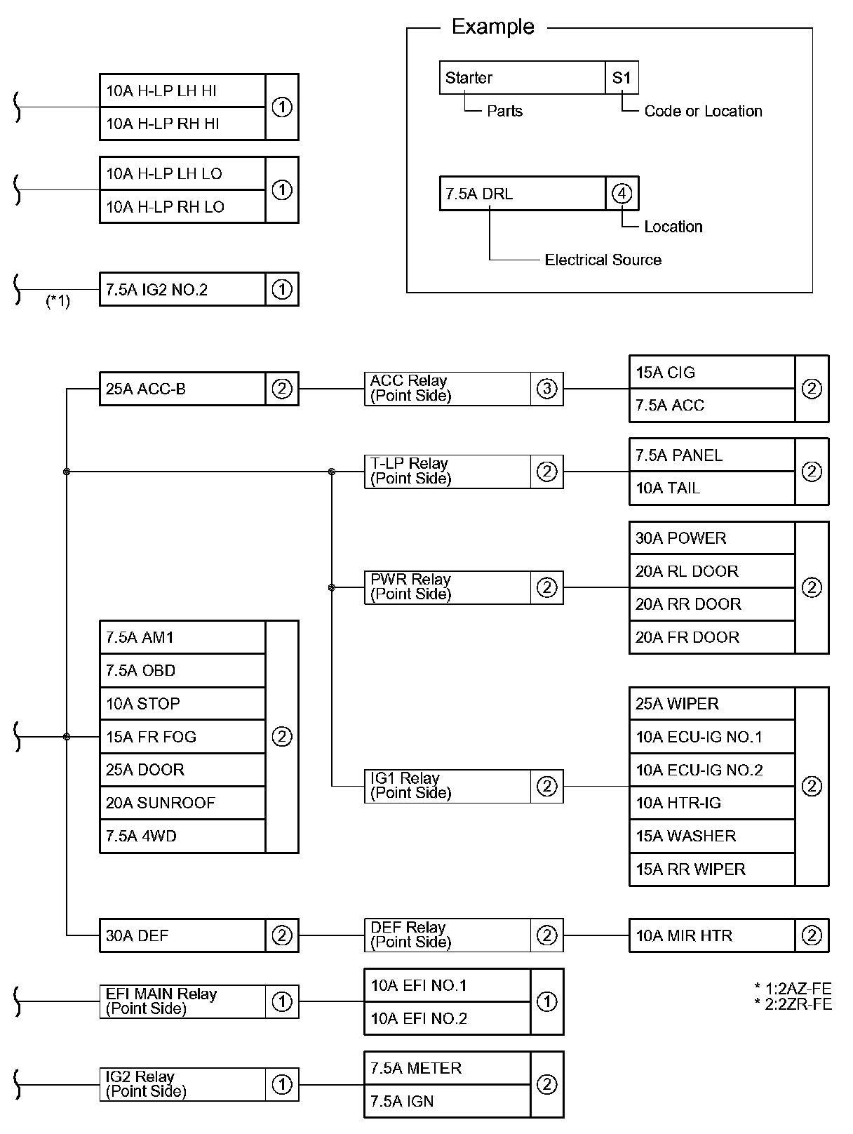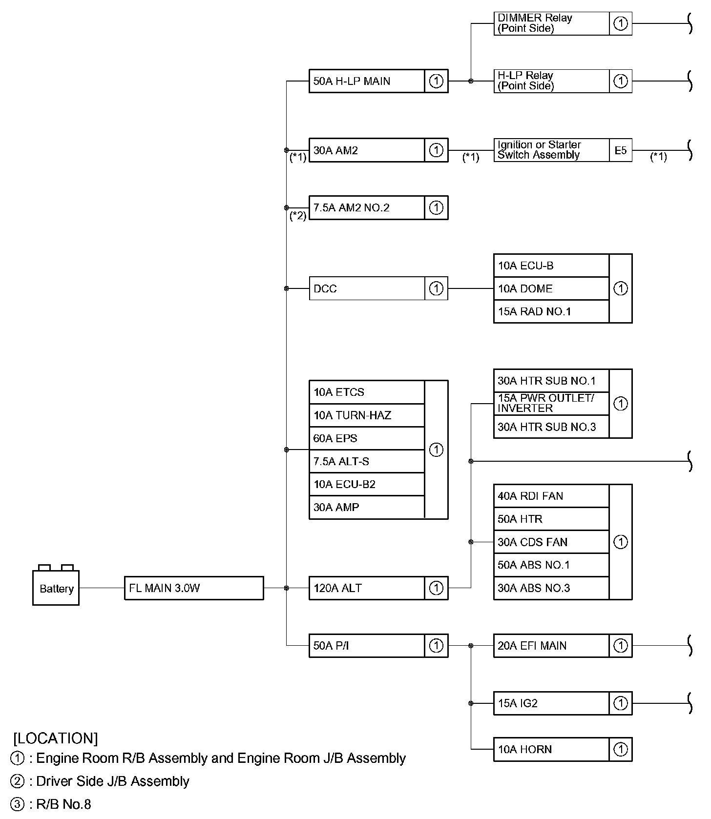 The chart below shows the route by which current flows from the battery to each electrical source (