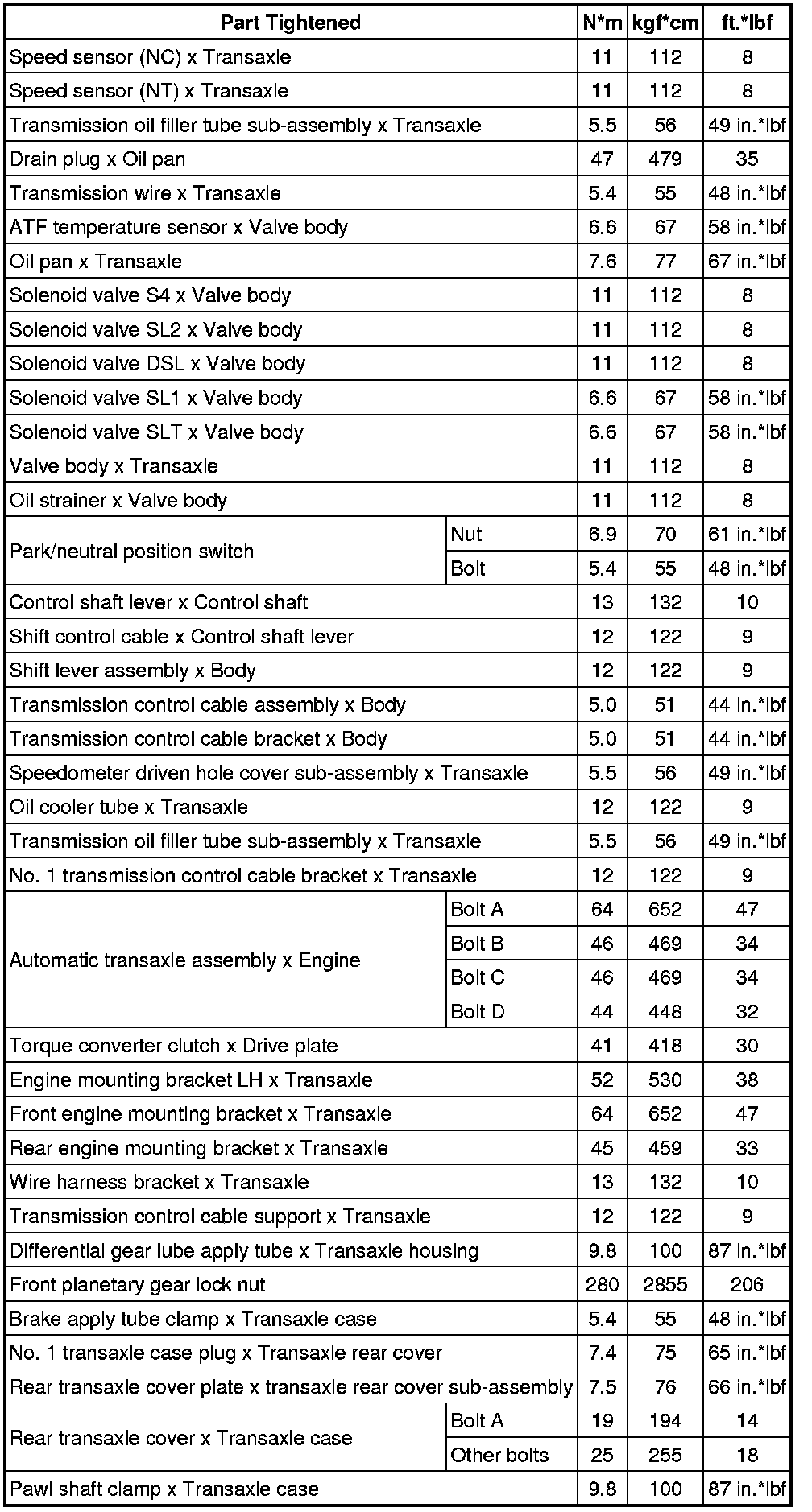 SPECIFICATIONS: U140F AUTOMATIC TRANSMISSION / TRANSAXLE: TORQUE SPECIFICATIONS