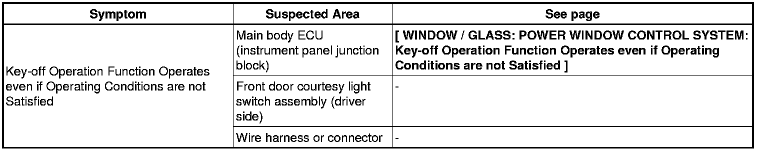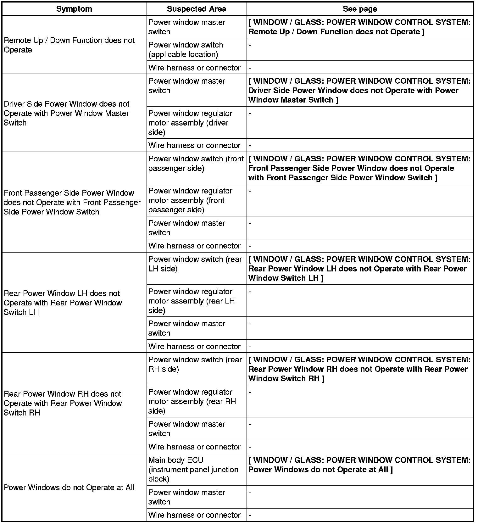 WINDOW / GLASS: POWER WINDOW CONTROL SYSTEM: PROBLEM SYMPTOMS TABLE