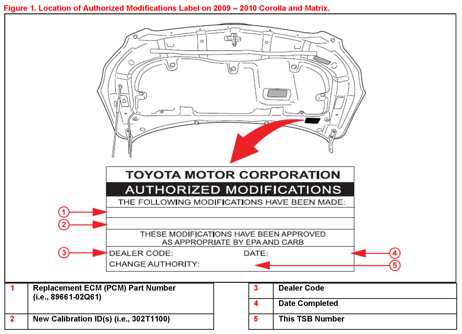 1. Check for the Authorized Modifications Label affixed to the vehicle in the location shown in Figure 1. Confirm if the ECM (PCM) calibration has been updated. If the calibration ID listed is NOT the latest ECM (PCM) calibration - go to step 2.