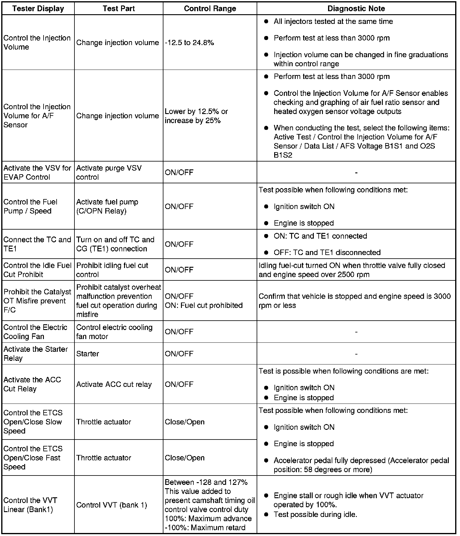 Using the Techstream to perform the Active Tests allows relays, VSVs, actuators and other items to be operated without removing any parts. This non-intrusive functional inspection can be very useful because intermittent operation may be discovered before parts or wiring is disturbed. Performing Active Tests early in troubleshooting is one way to save diagnostic time. Data List information can be displayed while performing Active Tests.