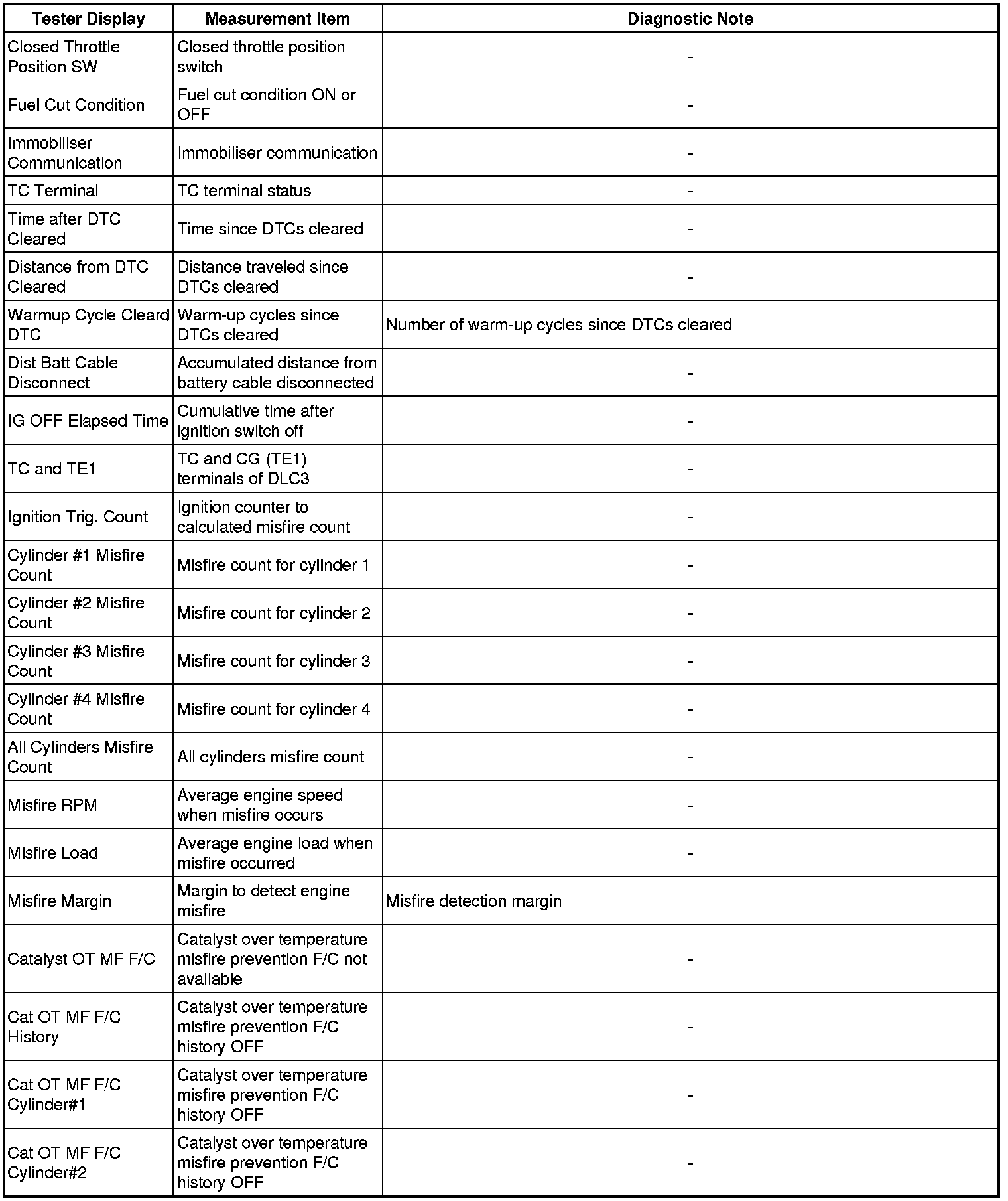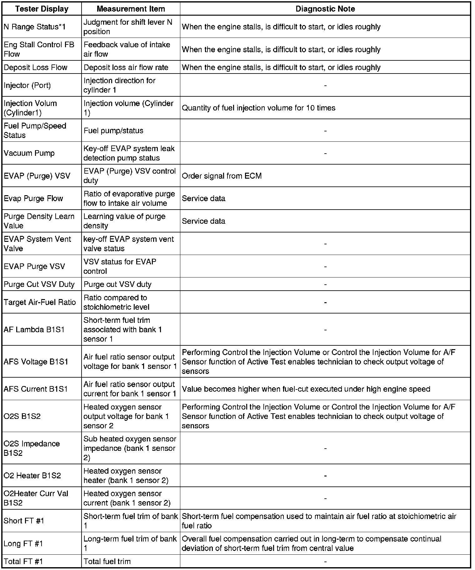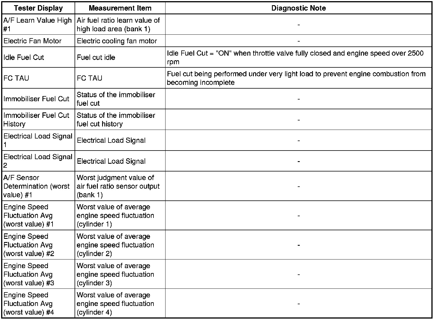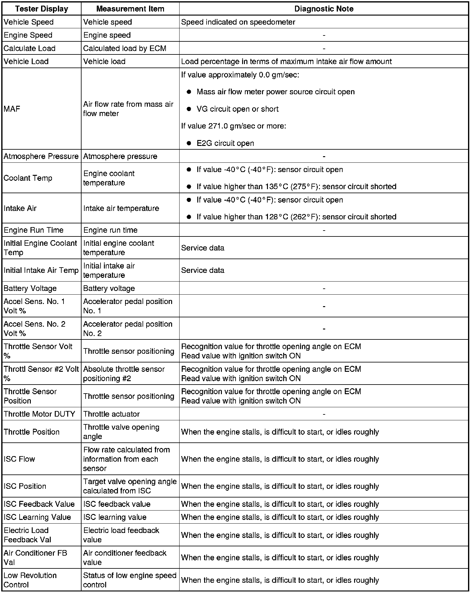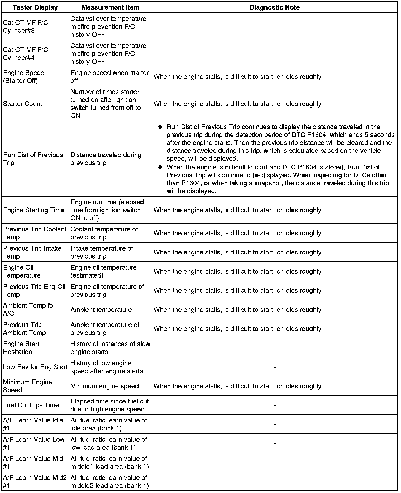 The ECM records engine conditions in the form of freeze frame data every 0.5 seconds. Using the Techstream, five separate sets of freeze frame data, including the data values at the time when the DTC was set, can be checked.