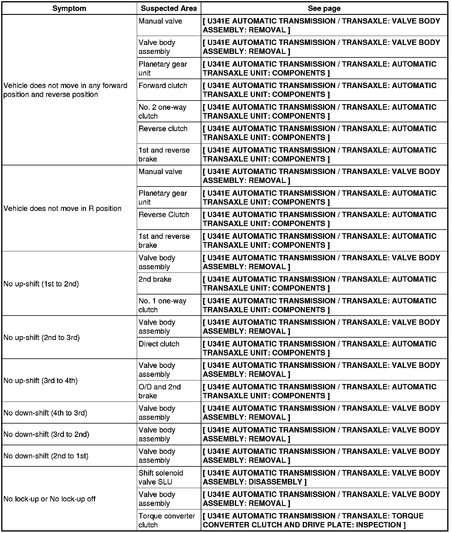 U341E AUTOMATIC TRANSMISSION / TRANSAXLE: AUTOMATIC TRANSAXLE SYSTEM: PROBLEM SYMPTOMS TABLE