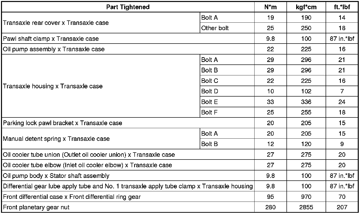 SPECIFICATIONS: U250E AUTOMATIC TRANSMISSION / TRANSAXLE: TORQUE SPECIFICATIONS