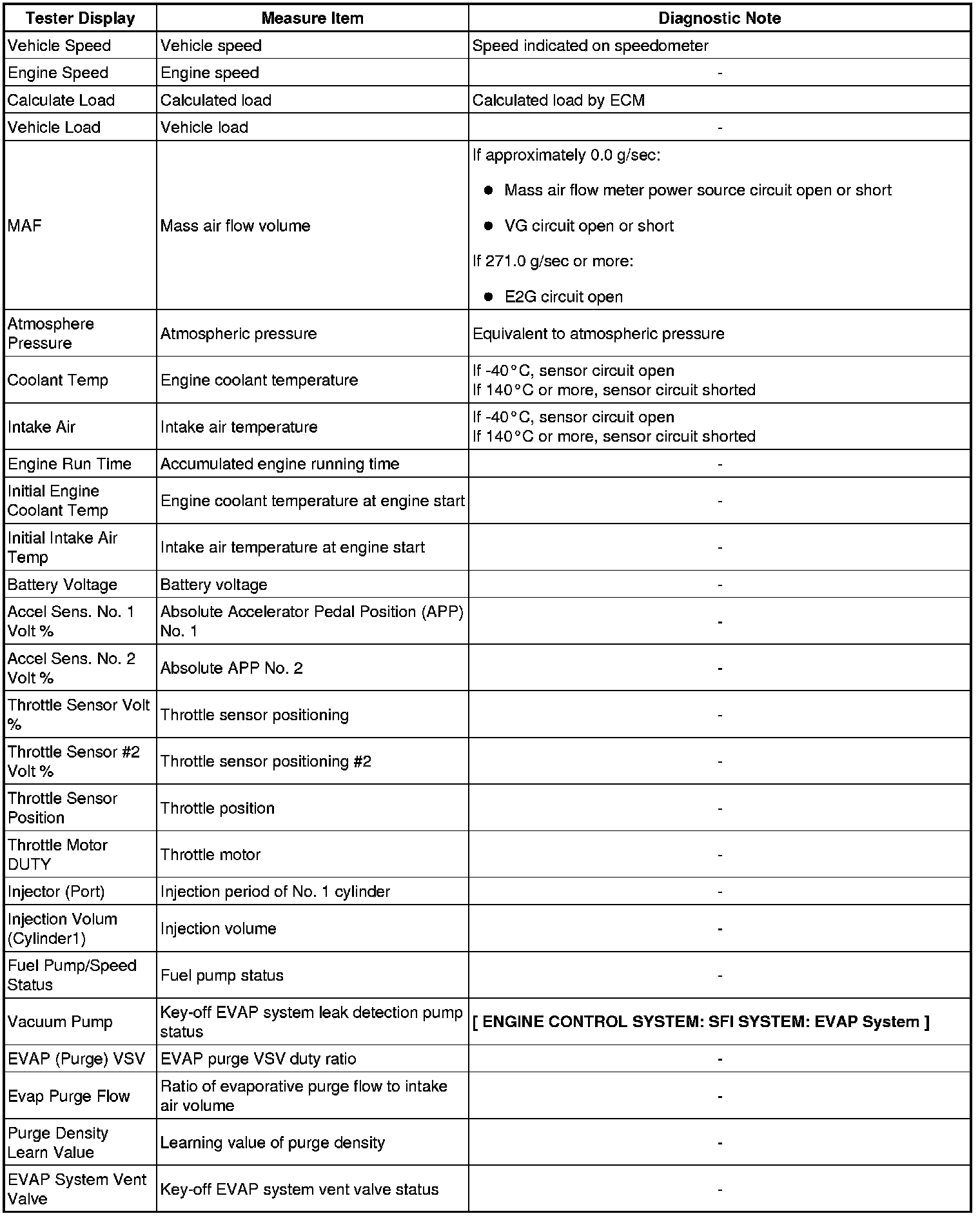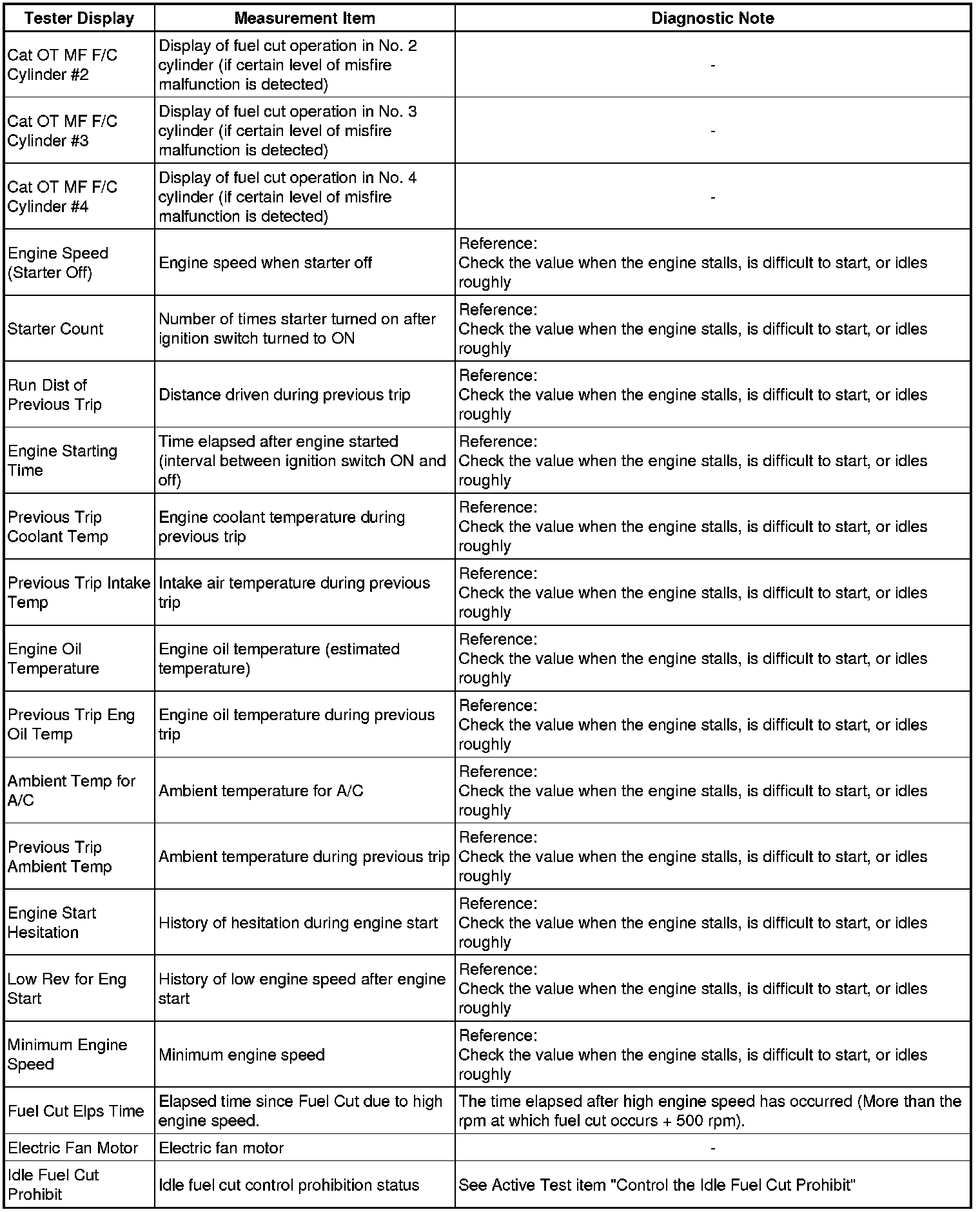 Freeze frame data records the engine conditions (fuel system, calculated load, engine coolant temperature, fuel trim, engine speed, vehicle speed, etc.) when a malfunction is detected. When troubleshooting, it can help determine if the vehicle was running or stopped, the engine was warmed up or not, the air-fuel ratio was Lean or Rich, and other data, from the time the malfunction occurred.
