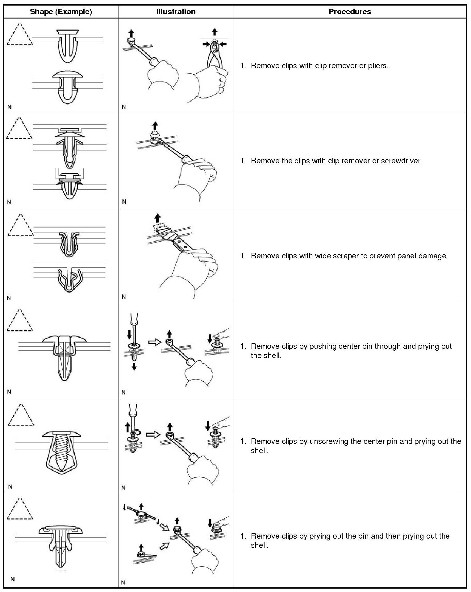 (1) The removal and installation methods of typical clips used for vehicle body parts are shown in the table below.