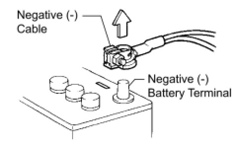 When the cable is disconnected from the negative (-) battery terminal, clock and audio system memory is erased. Before starting work, make a note of the settings of each memory system. When work is finished, reset the clock and audio system as before.