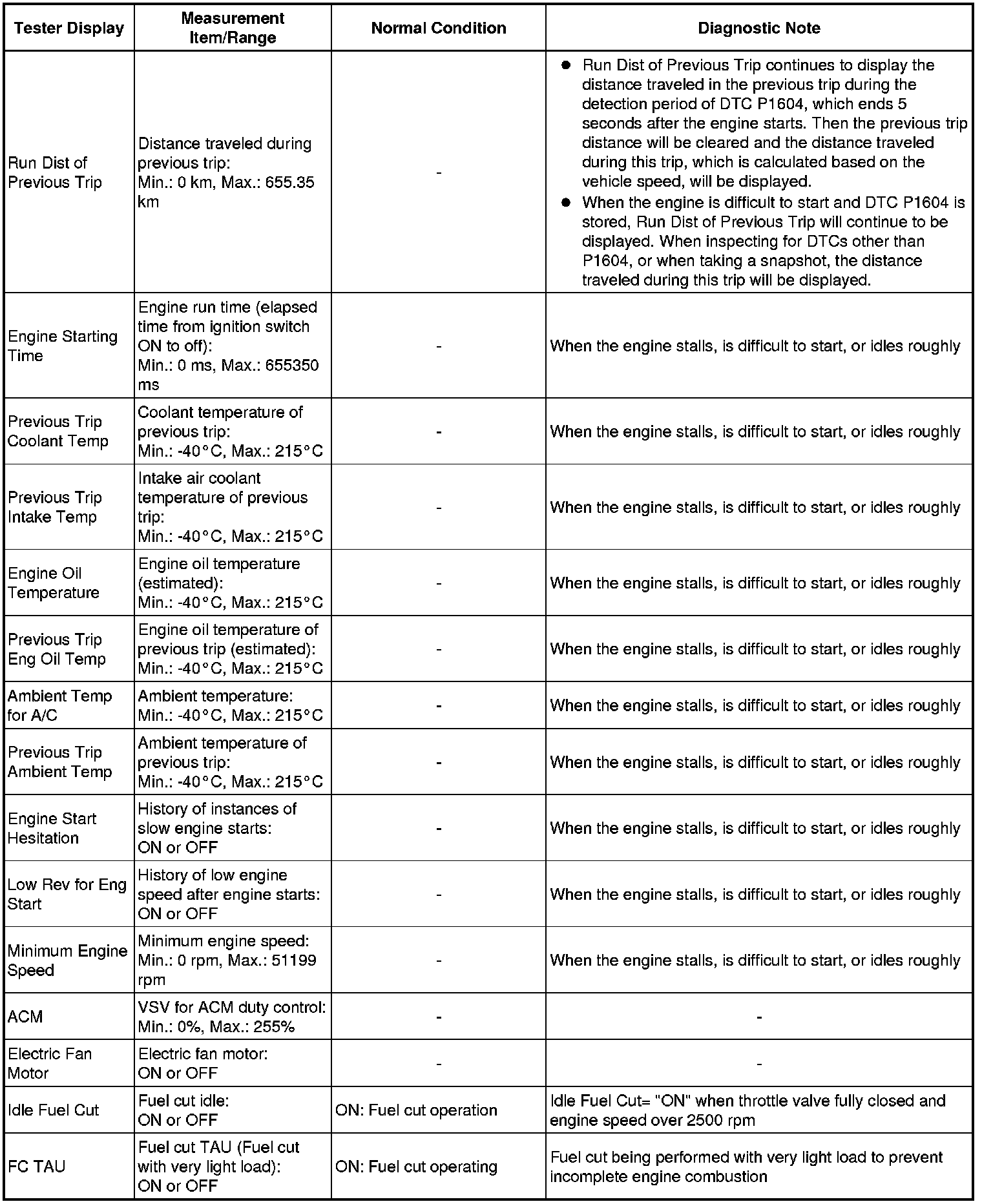Using the Techstream to read the Data List allows the values or states of switches, sensors, actuators and other items to be read without removing any parts. This non-intrusive inspection can be very useful because intermittent conditions or signals may be discovered before parts or wiring is disturbed. Reading the Data List information early in troubleshooting is one way to save diagnostic time.