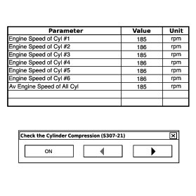 In this Active Test, the fuel and ignition of all cylinders is cut. The engine must then be cranked for approximately 10 seconds. At this time, the speed of each cylinder is measured. If the speed of one cylinder is more than the other cylinders, it can be determined that the compression pressure of that cylinder is lower than the other cylinders.
