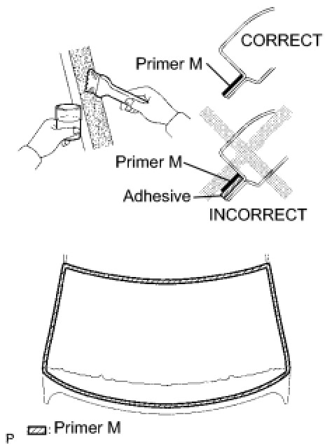 (b) Using a brush, coat the exposed areas of the vehicle body, where all adhesive has been removed with Primer M.