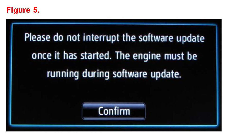 7. A "Please do not interrupt the software update once it is started. The engine must be running during software update." message will be displayed.