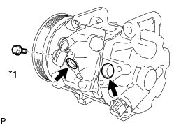(d) Install the No. 1 cooler refrigerant suction hose onto the compressor assembly with pulley with the bolt.