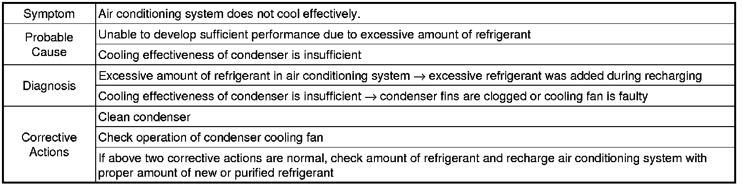 For the example above, the air conditioning system is overcharged or cooling effectiveness of condenser is insufficient.