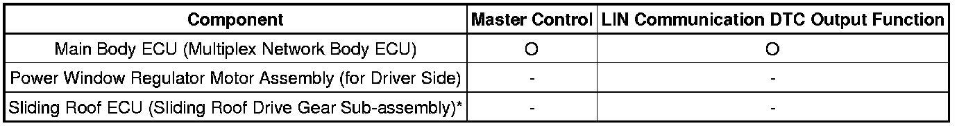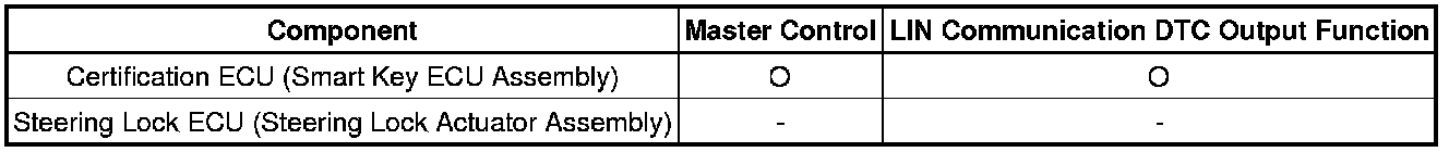 The LIN communication system is used for communication between the components in the tables below. If communication cannot be performed through LIN communication because of an open in the communication lines or other reasons, the master control ECU of the relevant system will store a DTC. Refer to the table below about the communication bus lines and connected components.