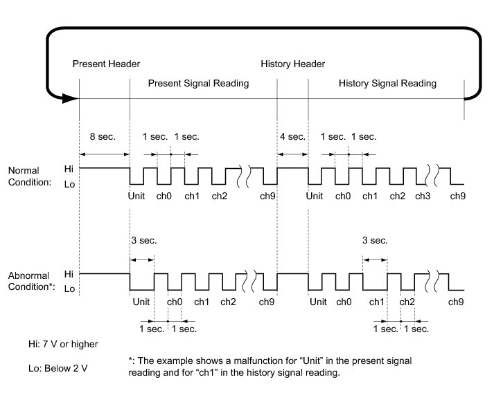 * Present signal reading and history signal reading will be displayed alternately after the ignition switch is turned to ON. By measuring the duration of each header, the present signal reading and history signal reading can be recognized.