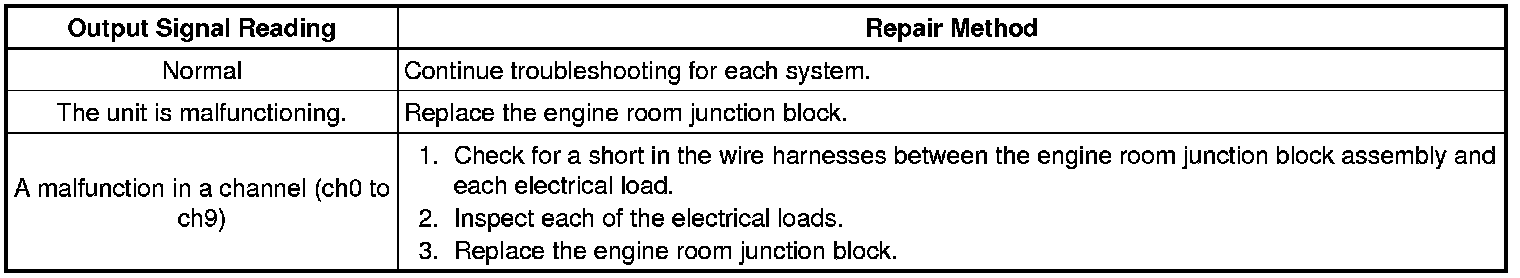 * A unit malfunction indicates an internal malfunction of the engine room junction block assembly. If a malfunction is detected for any channel from channel 0 to 9, an electrical load connected to the engine room junction block assembly may be malfunctioning or there may be a short in the engine room junction block assembly circuit or in the wire harness.