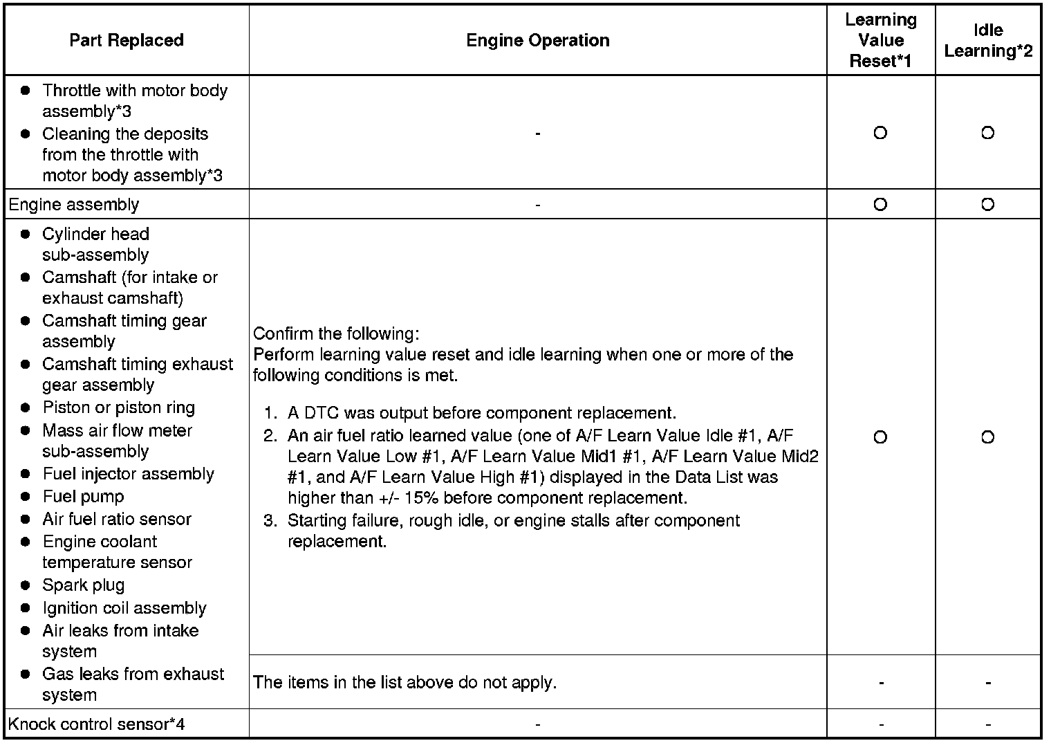 Perform learning value reset and idle learning after replacing or servicing parts related to engine operation. Details on procedures required are indicated by an asterisk and a number, and are explained in detail following the table.