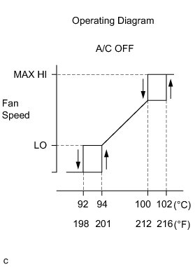 * The coolant temperature at which the fan starts operating is approximately 94°C (201°F).