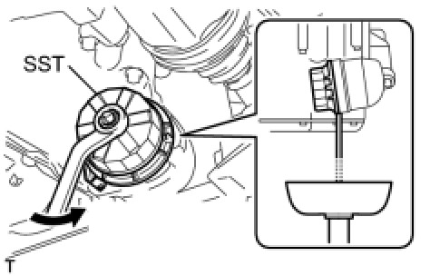 (a) Using SST, loosen the oil filter cap 4 revolutions, align the cap ribs vertically, and drain the remaining engine oil in the oil filter cap.