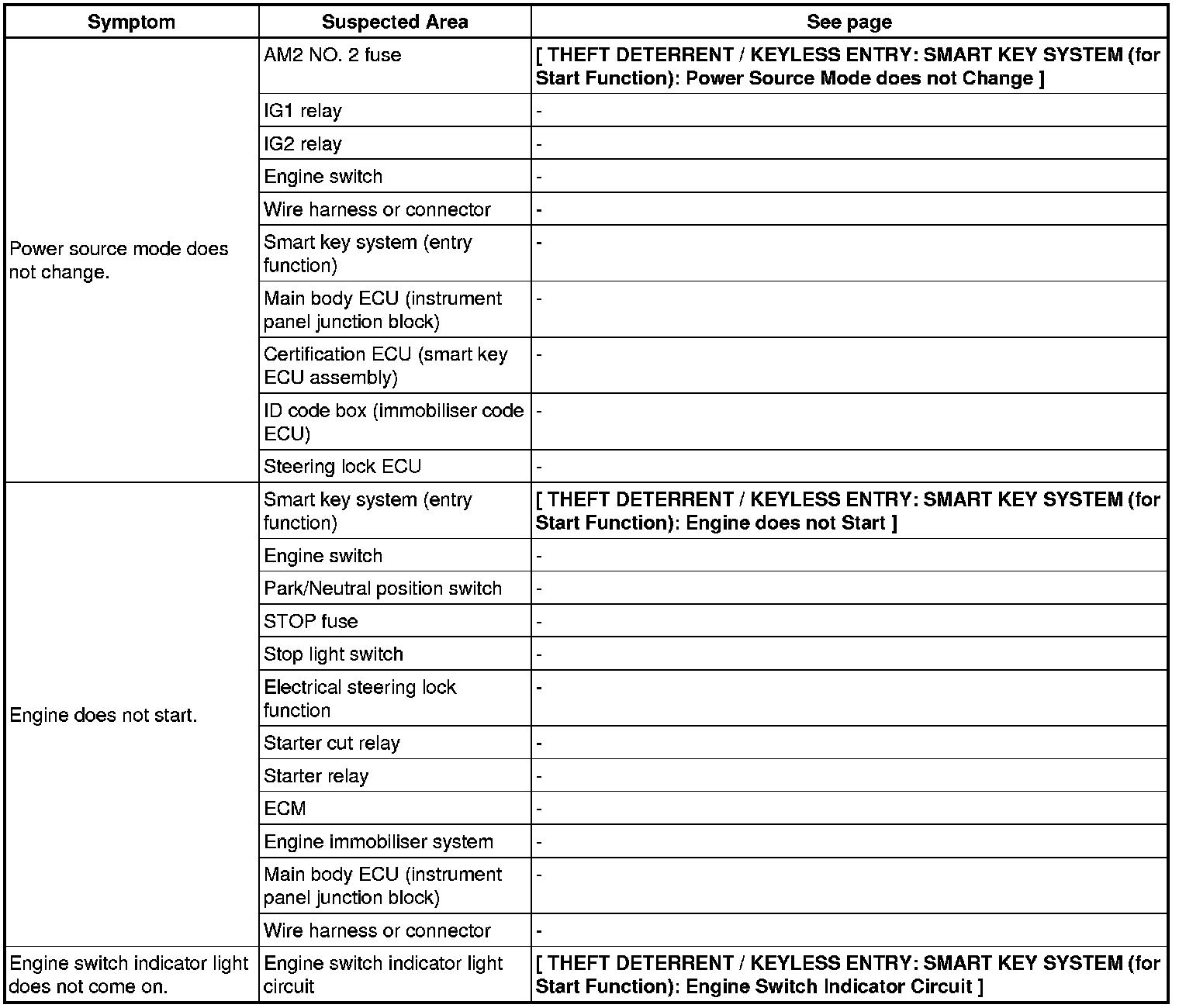 THEFT DETERRENT / KEYLESS ENTRY: SMART KEY SYSTEM (for Start Function): PROBLEM SYMPTOMS TABLE