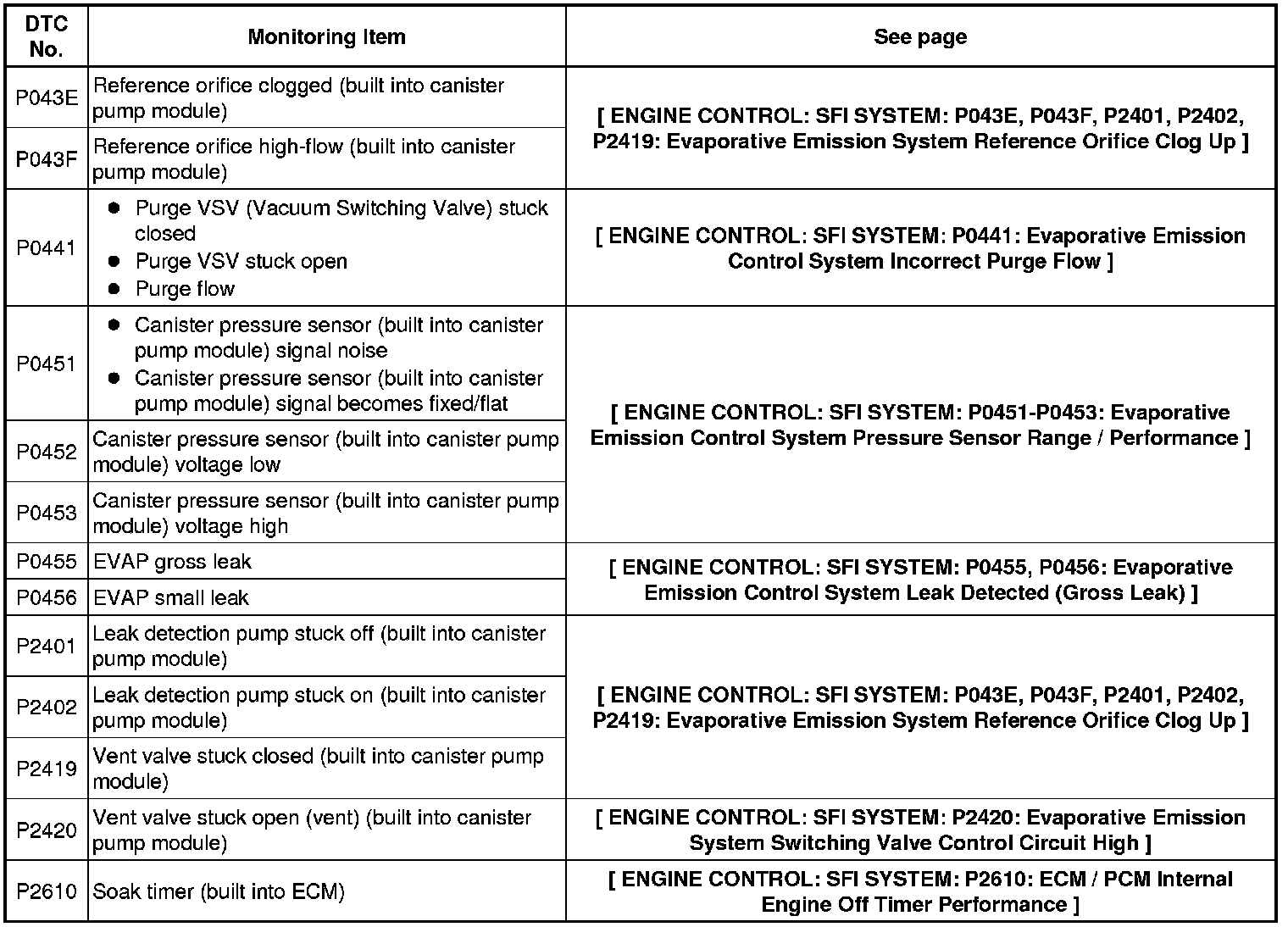 If any EVAP system DTCs are output, the malfunctioning area can be determined using the table below.