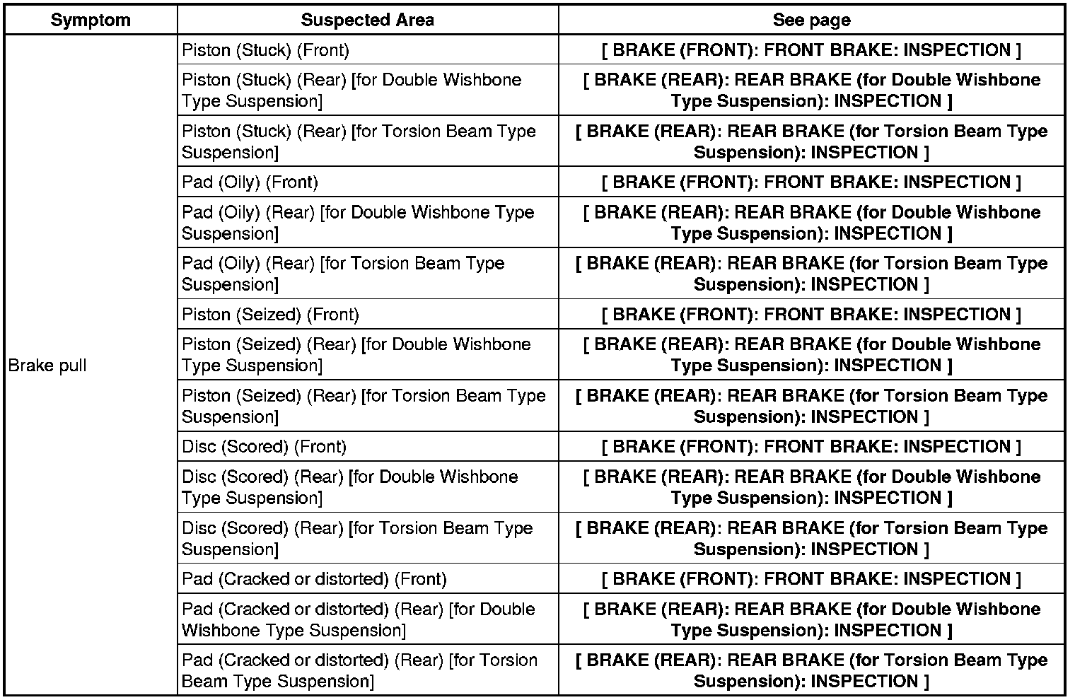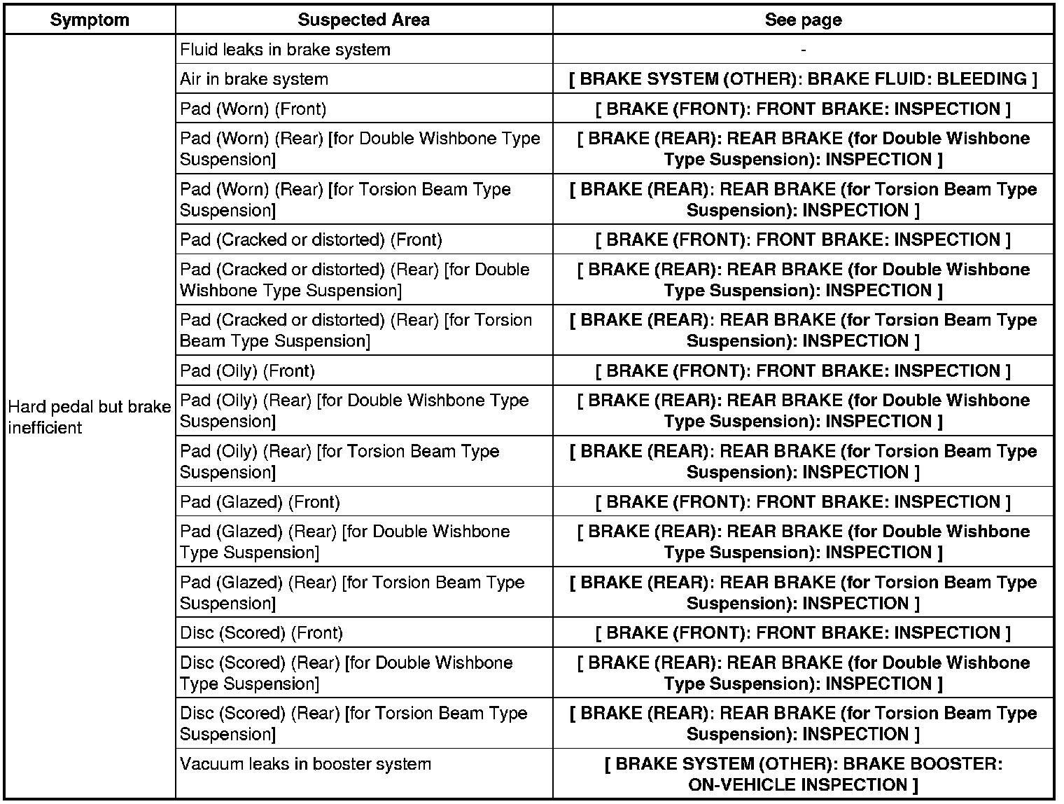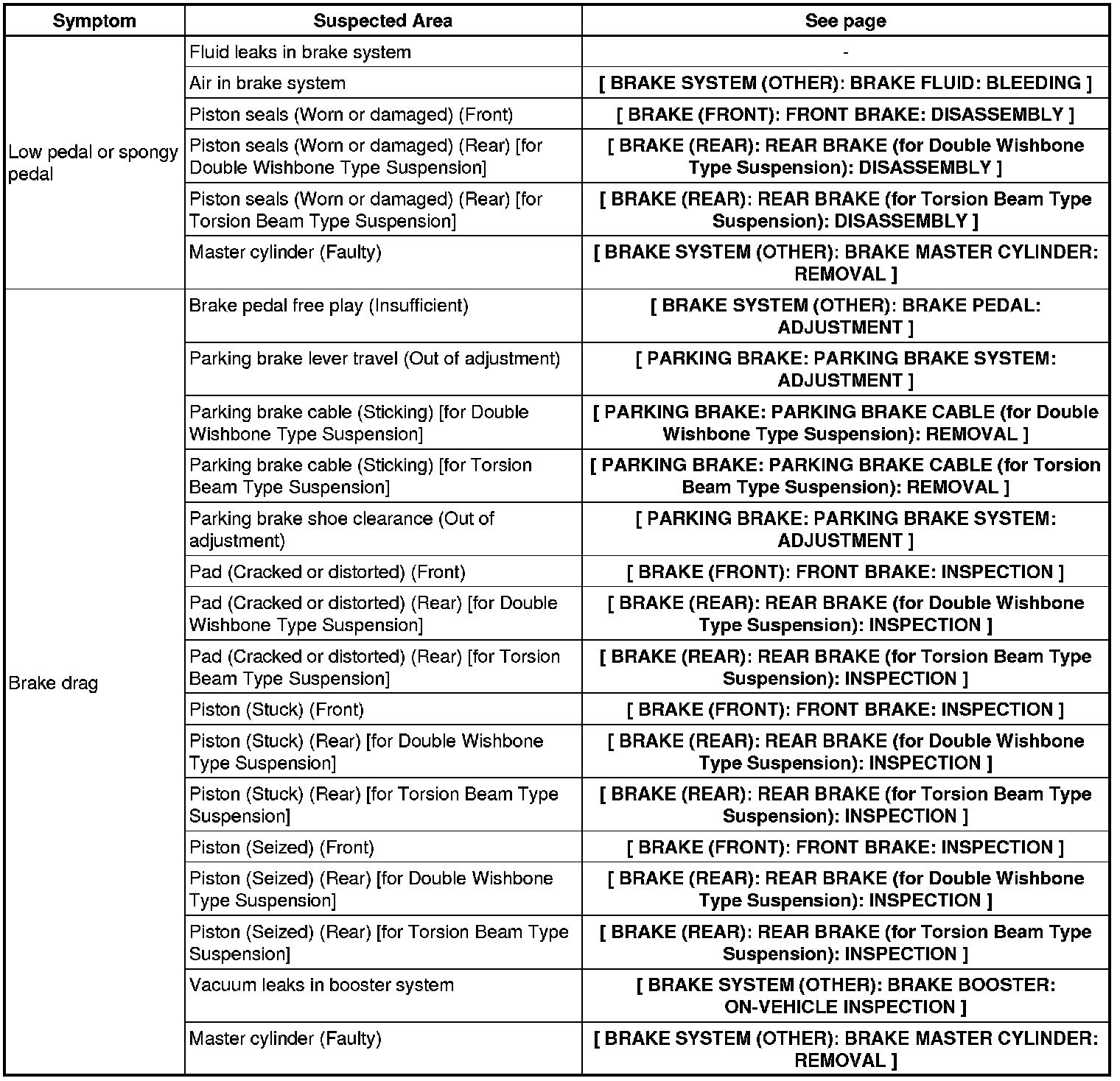 BRAKE SYSTEM (OTHER): BRAKE SYSTEM: PROBLEM SYMPTOMS TABLE
