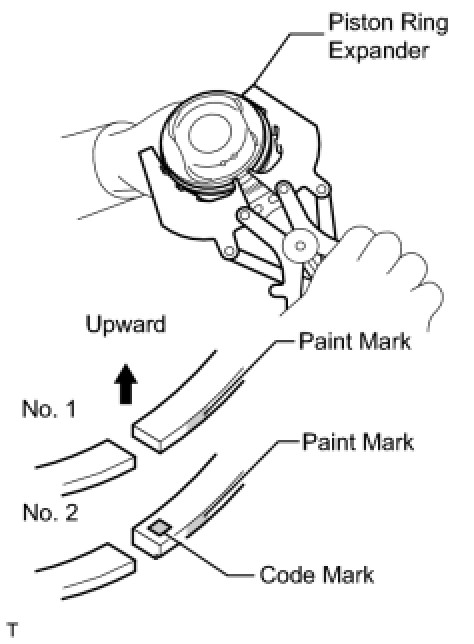 Install the No. 2 compression ring with the code mark (2N or 2A) facing upward.