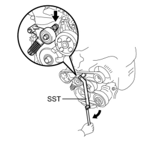 (a) Using SST, slowly turn the V-ribbed belt tensioner clockwise and install the V-ribbed belt.
