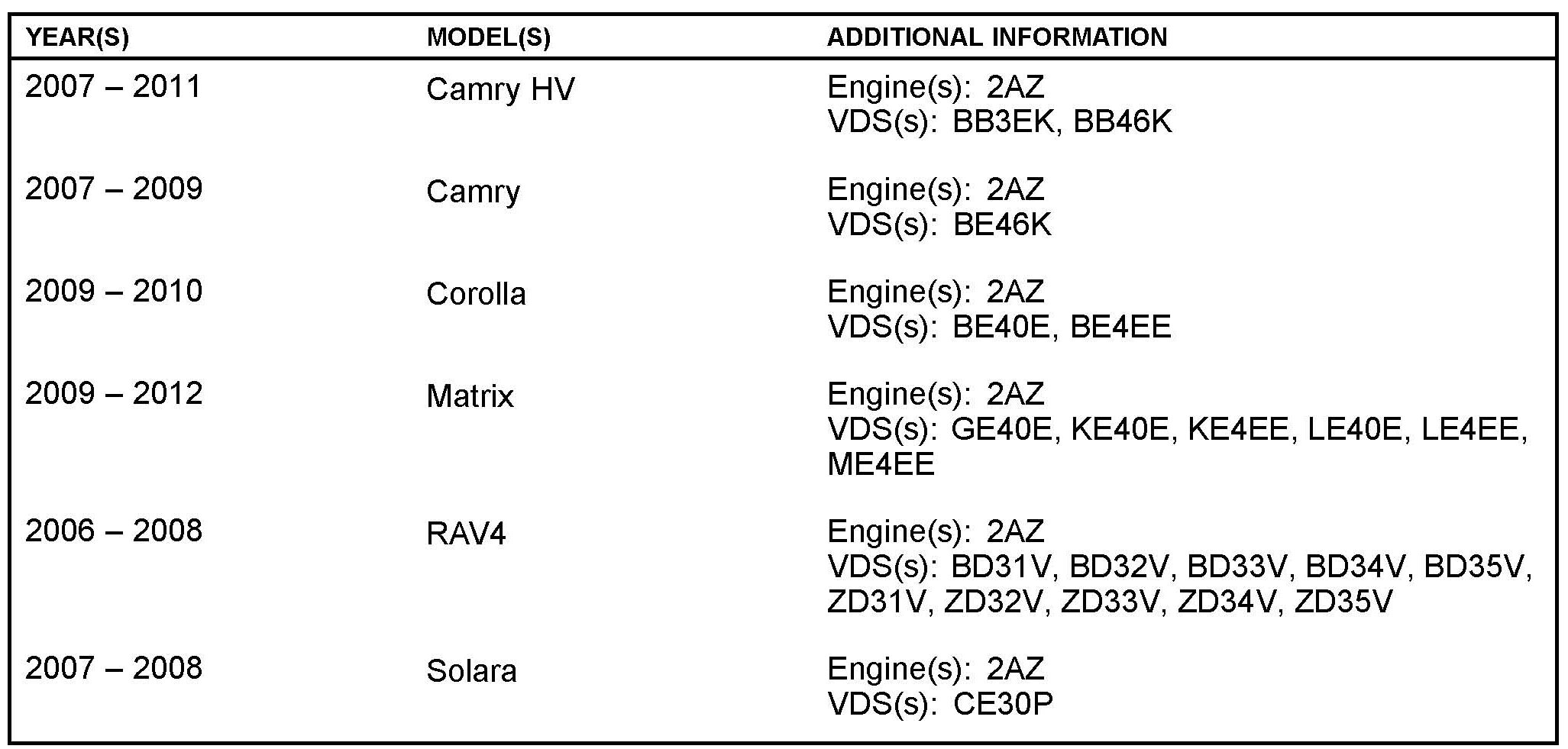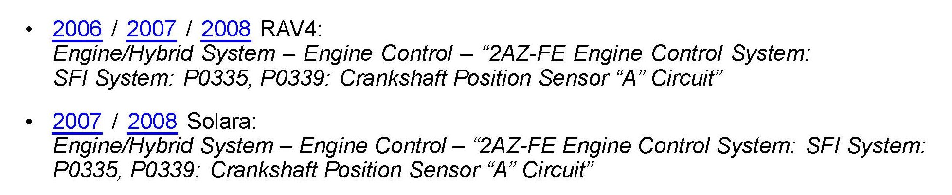 Some 2006 - 2012 model year vehicles equipped with the 2AZ engine may exhibit an intermittent MIL "ON" condition with Diagnostic Trouble Code (DTC) P0335 (Crankshaft Position Sensor "A" Circuit) stored. The intake camshaft gear assembly has been improved to help prevent this condition.