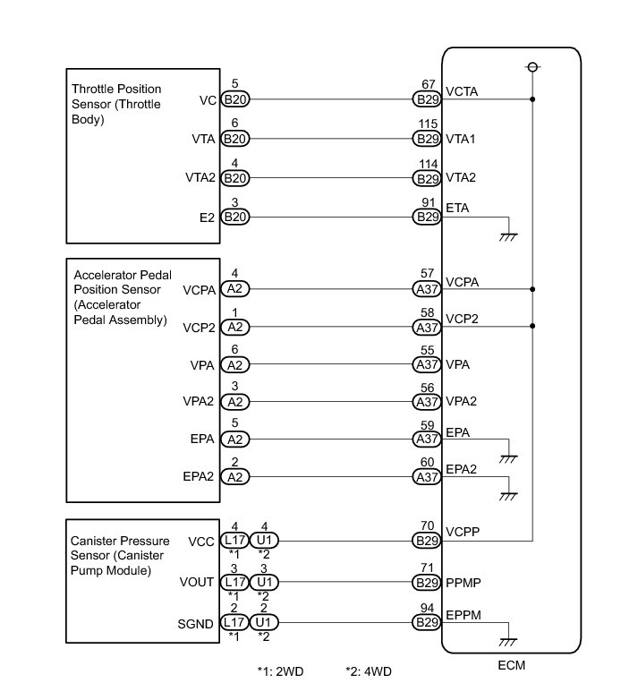 The ECM constantly generates 5 V power from the battery voltage supplied to the +B (BATT) terminal to operate the microprocessor. The ECM also provides this power to the sensors through the VC output circuit.