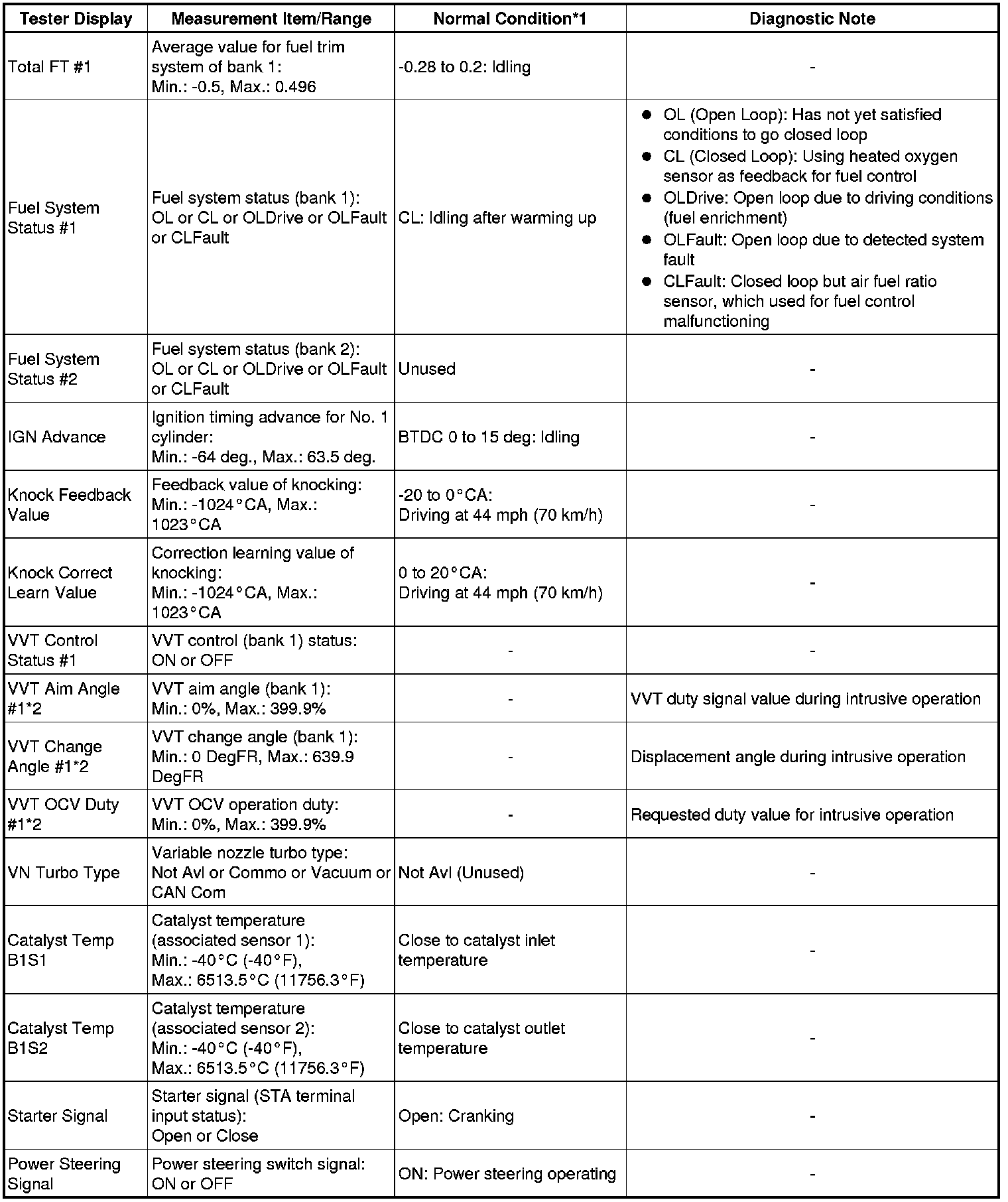 Using the Techstream to read the Data List allows the values or states of switches, sensors, actuators and other items to be read without removing any parts. This non-intrusive inspection can be very useful because intermittent conditions or signals may be discovered before parts or wiring is disturbed. Reading the Data List information early in troubleshooting is one way to save diagnostic time