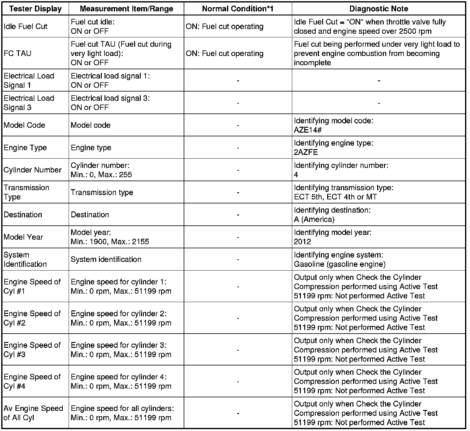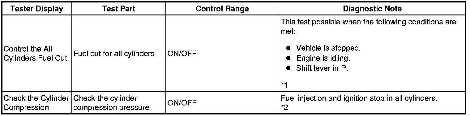 *2: In this Active Test, the fuel and ignition of all cylinders is cut. The engine must then be cranked for approximately 10 seconds. At this time, the speed of each cylinder is measured. If the speed of one cylinder is more than the other cylinders, it can be determined that the compression pressure of that cylinder is lower than the other cylinders.