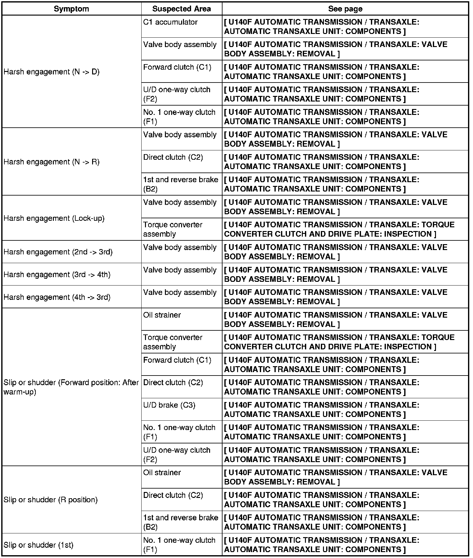 U140F AUTOMATIC TRANSMISSION / TRANSAXLE: AUTOMATIC TRANSAXLE SYSTEM: PROBLEM SYMPTOMS TABLE