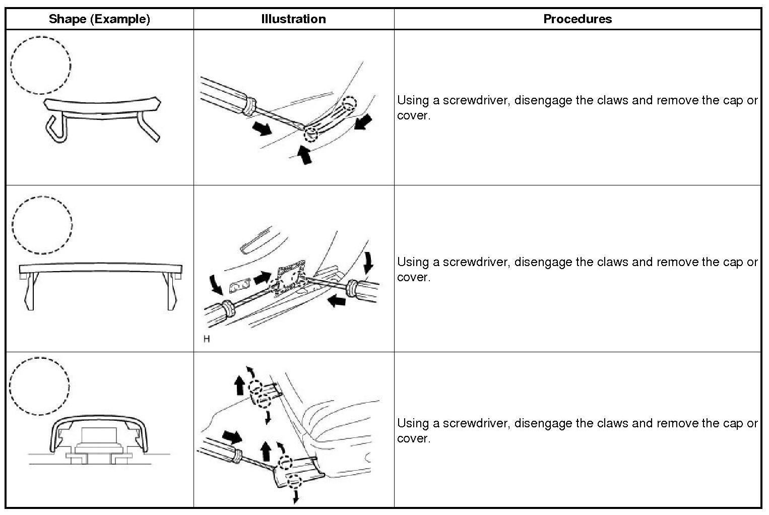 (1) The removal and installation methods of typical claws used for vehicle body parts are shown in the table below.