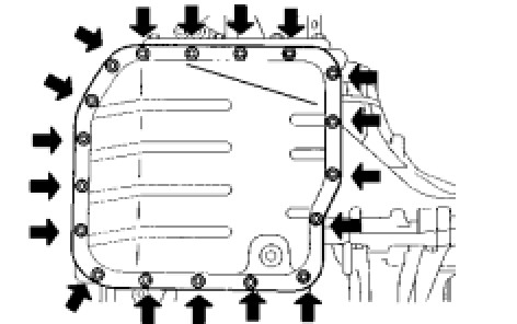 Install a new gasket and the oil pan with the 18 bolts.