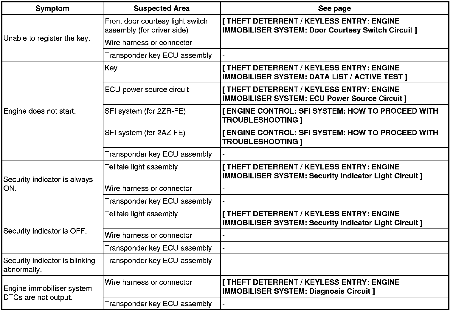 THEFT DETERRENT / KEYLESS ENTRY: ENGINE IMMOBILISER SYSTEM: PROBLEM SYMPTOMS TABLE