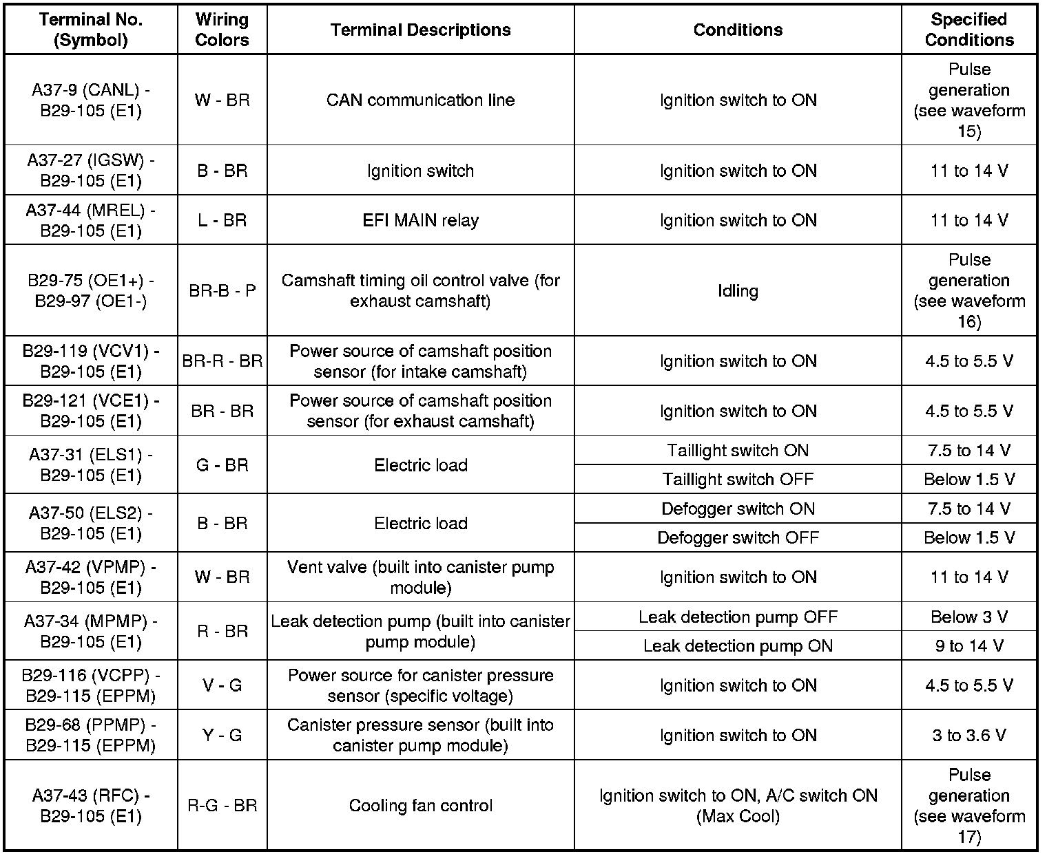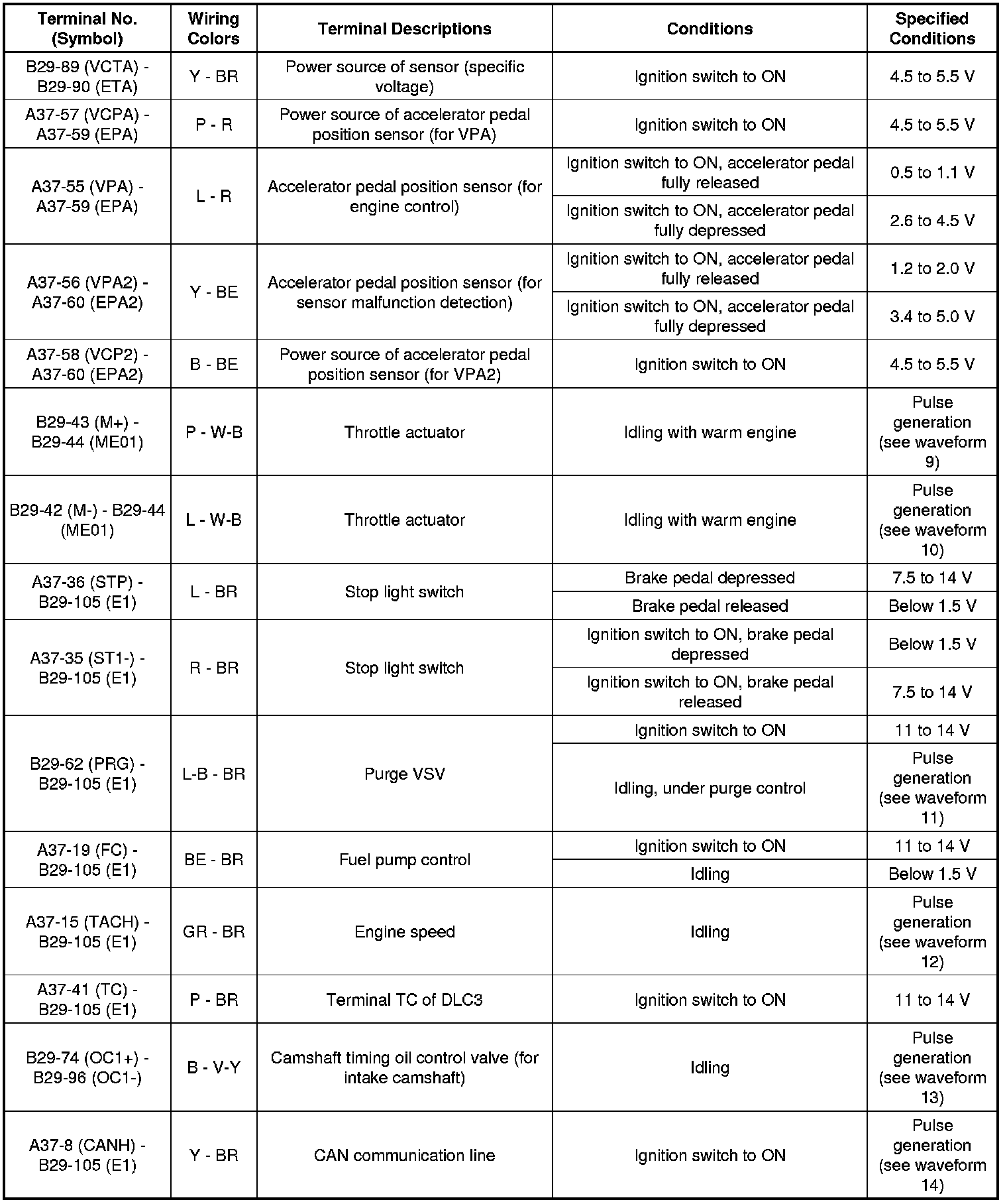 The standard normal voltage between each pair of the ECM terminals is shown in the table below. The appropriate conditions for checking each pair of the terminals are also indicated. The result of checks should be compared with the standard normal voltage for that pair of the terminals, and displayed in the "Specified Conditions" column. The illustration above can be used as a reference to identify the ECM terminal locations.