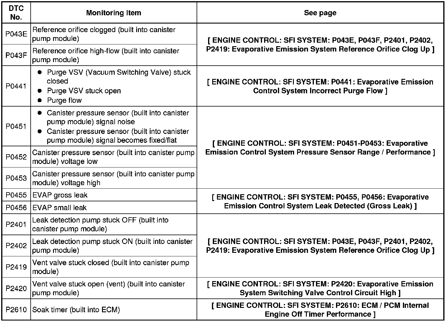 If the reference pressure difference between the first and second checks is more than the specification, all the DTCs relating to the reference pressure (P043E, P043F, P0441, P0455, P0456, P2401, P2420) will all be stored.