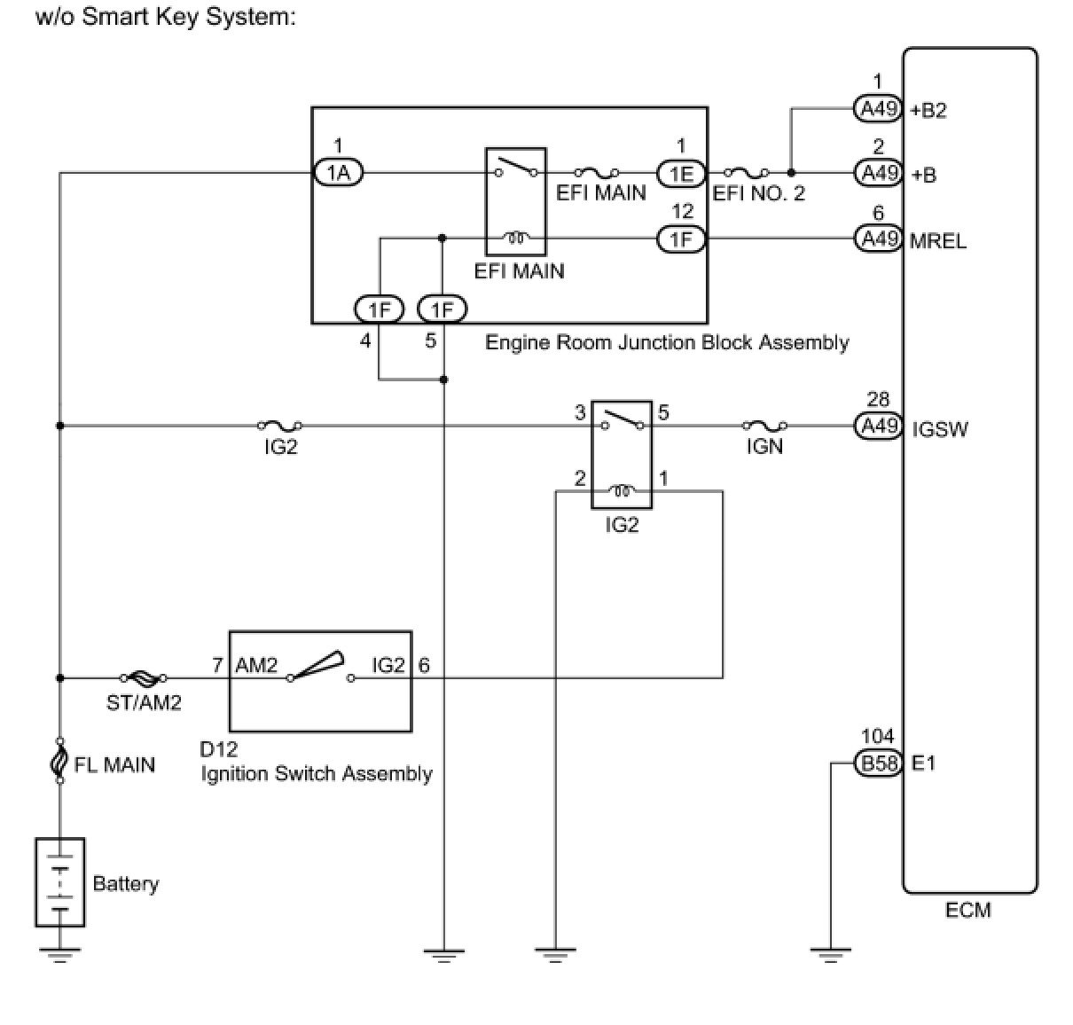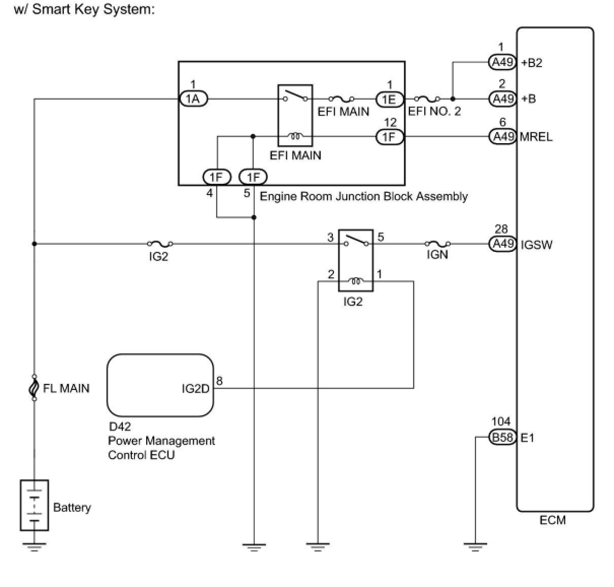 When the ignition switch is turned to ON, the battery voltage is applied to IGSW of the ECM. The output signal from the MREL terminal of the ECM causes a current to flow to the coil, closing the contact of the engine room junction block assembly (EFI MAIN relay) and supplying power to terminals +B and +B2 of the ECM.