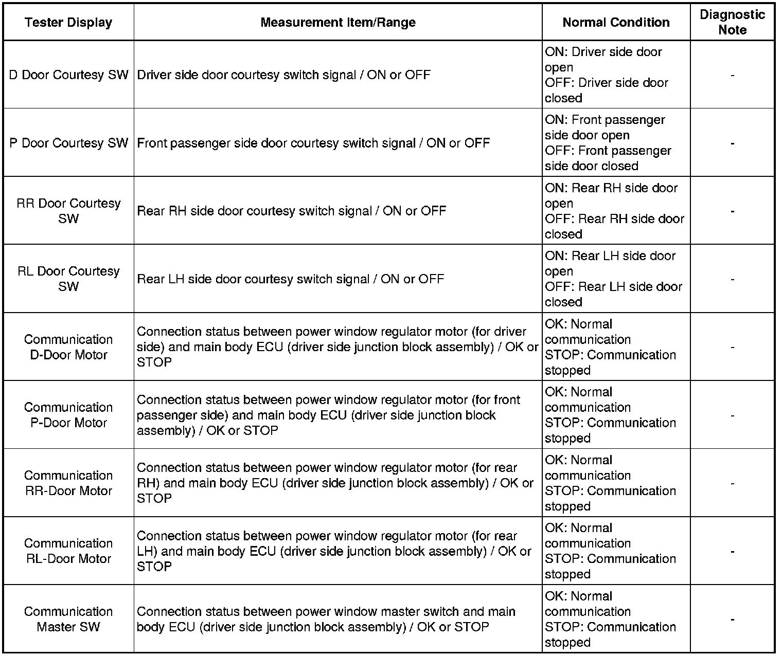 WINDOW / GLASS: POWER WINDOW CONTROL SYSTEM: DATA LIST / ACTIVE TEST