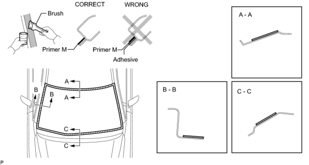 (a) Using a brush or a sponge, coat the application area of the windshield glass adhesive dam with Primer G.