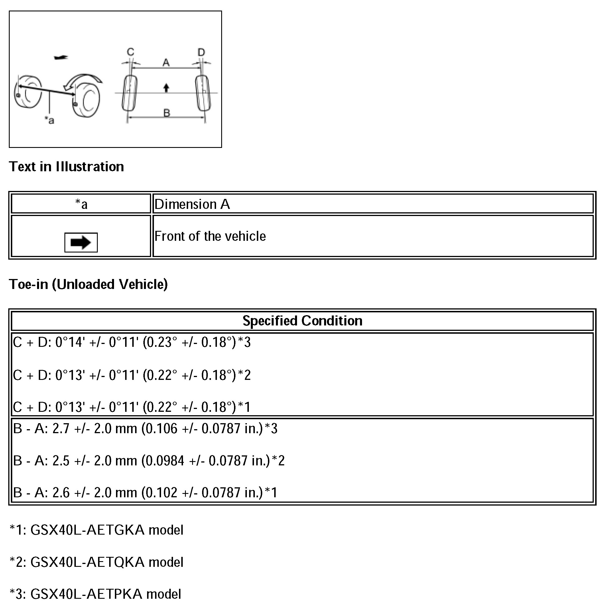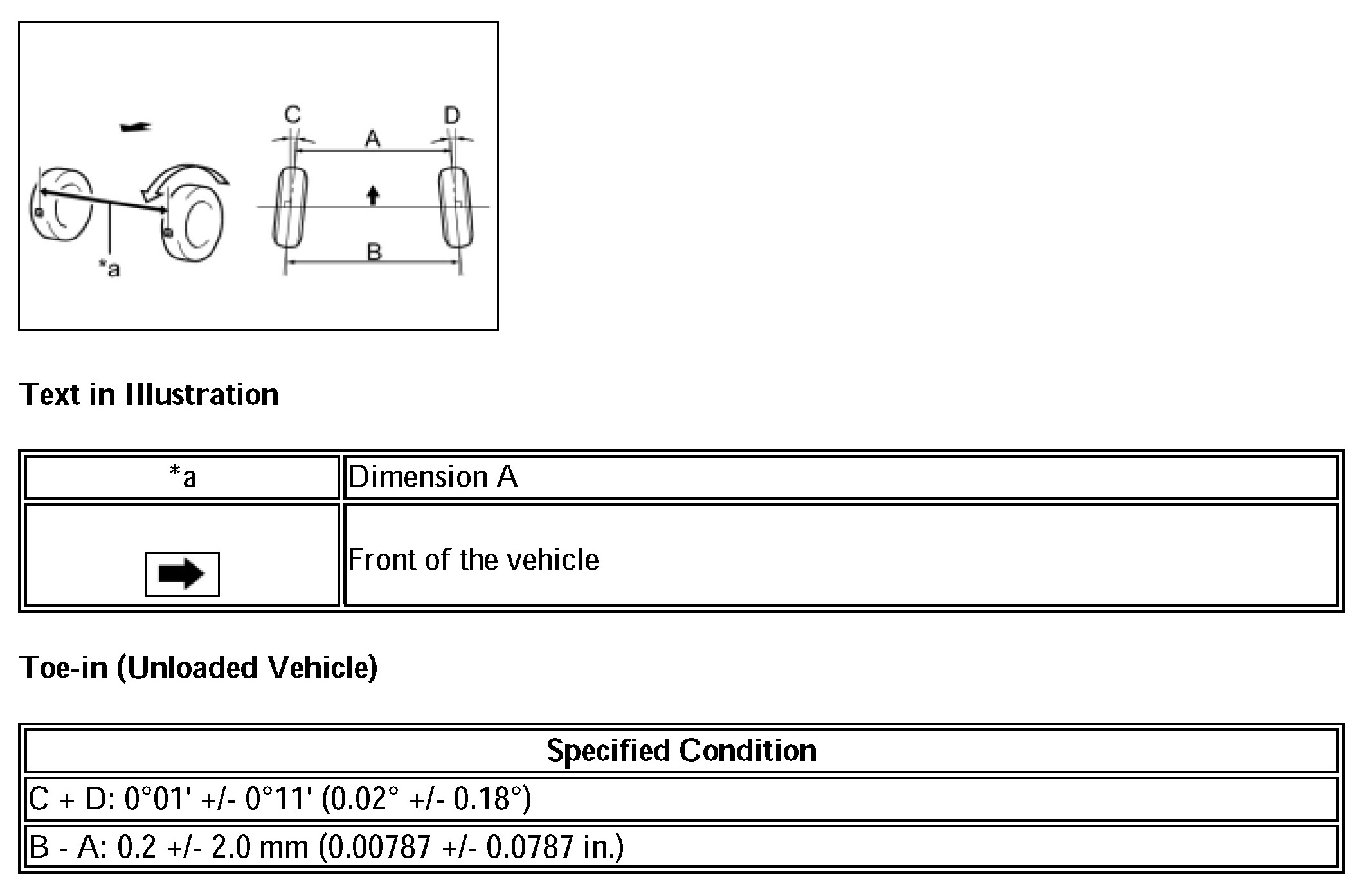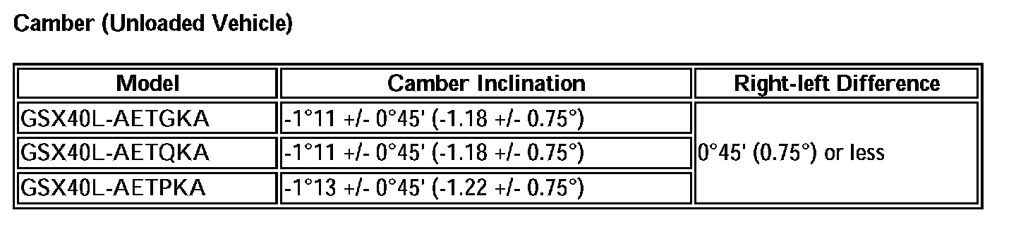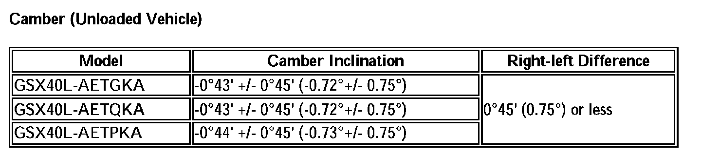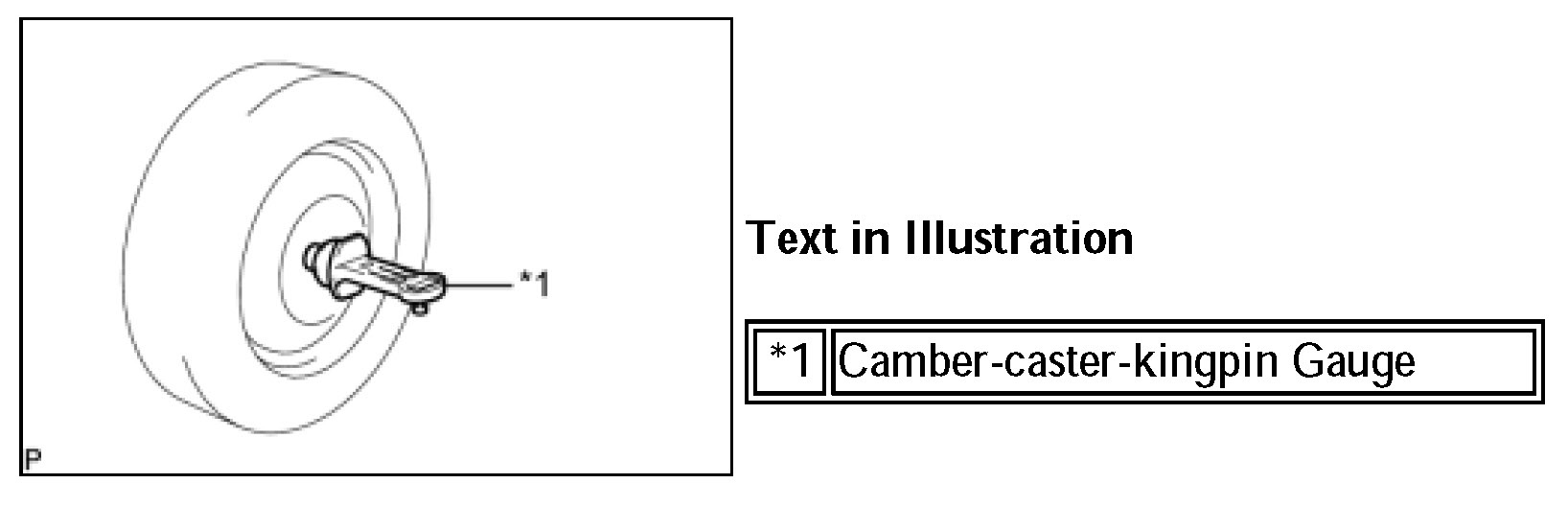 HINT: Camber is not adjustable. If the measurement is not within the specified range, inspect the suspension parts for damage and/or wear, and replace them if necessary.