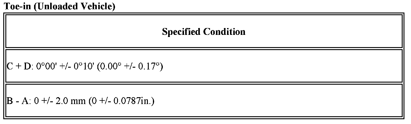 HINT: Camber is not adjustable. If the measurement is not within the specified range, inspect the suspension parts for damage and/or wear, and replace them if necessary.