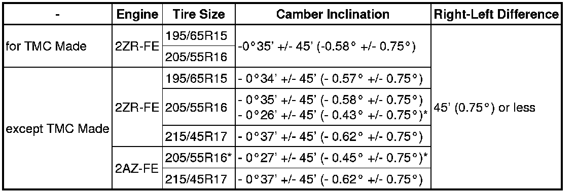 The body and suspension may be damaged if the camber is not correctly adjusted according to the table above.