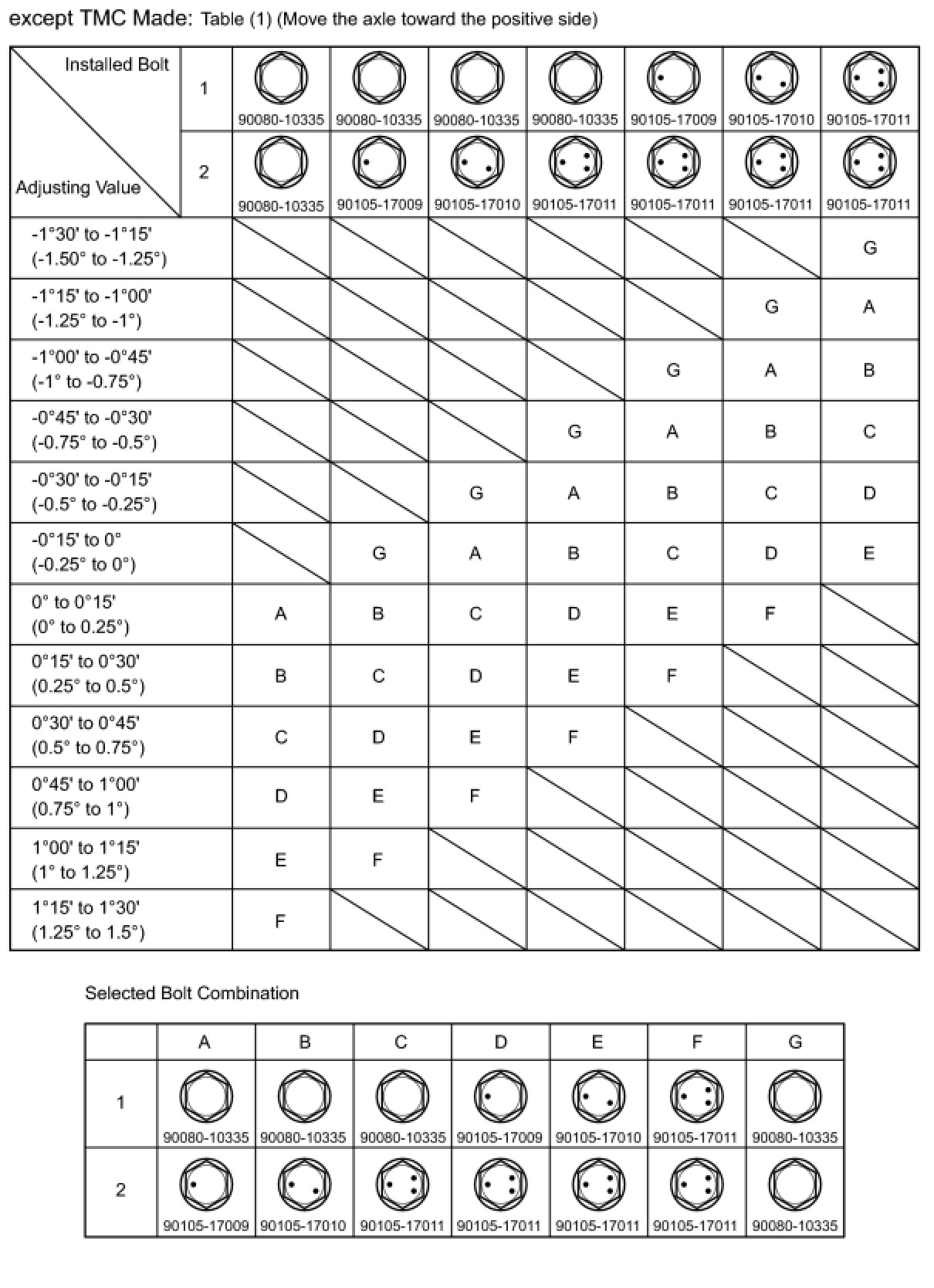 Check the combination of installed bolts. Select appropriate bolts from the table below to adjust the camber to the specified values.