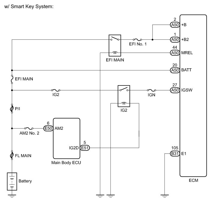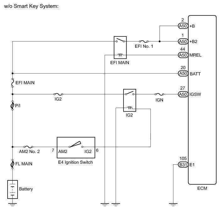 When the ignition switch is turned to the ON, battery voltage is applied to IGSW of the ECM. The output signal from the MREL terminal of the ECM causes a current to flow to the coil, closing the contacts of the integration relay (EFI MAIN relay) and supplying power to either terminals +B and +B2 of the ECM.