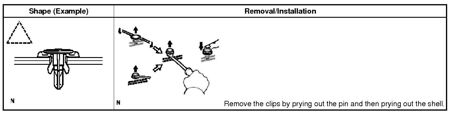 (1) The removal and installation methods of typical clips used for vehicle body parts are shown in the table below.