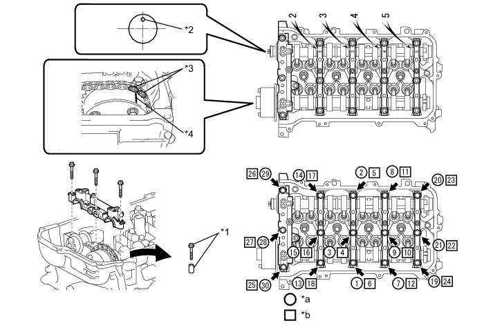 The cylinder head bolts are tightened in 2 progressive steps.